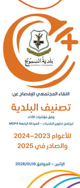 عقدت البلدية الإثنين 19/01/2026 اللقاء المجتمعي للإفصاح عن تصنيفها( +C)، والتقريرين المالي والإداري لعام 2025، بحضور رئيس البلدية السيد إبراهيم الرواشدة، ونائب الرئيس الأستاذ موسى أبو عواد، وعضوي المجلس البلدي الأستاذ يونس الحوامدة والأستاذ جعفر السلامين، وطواقم من البلدية .